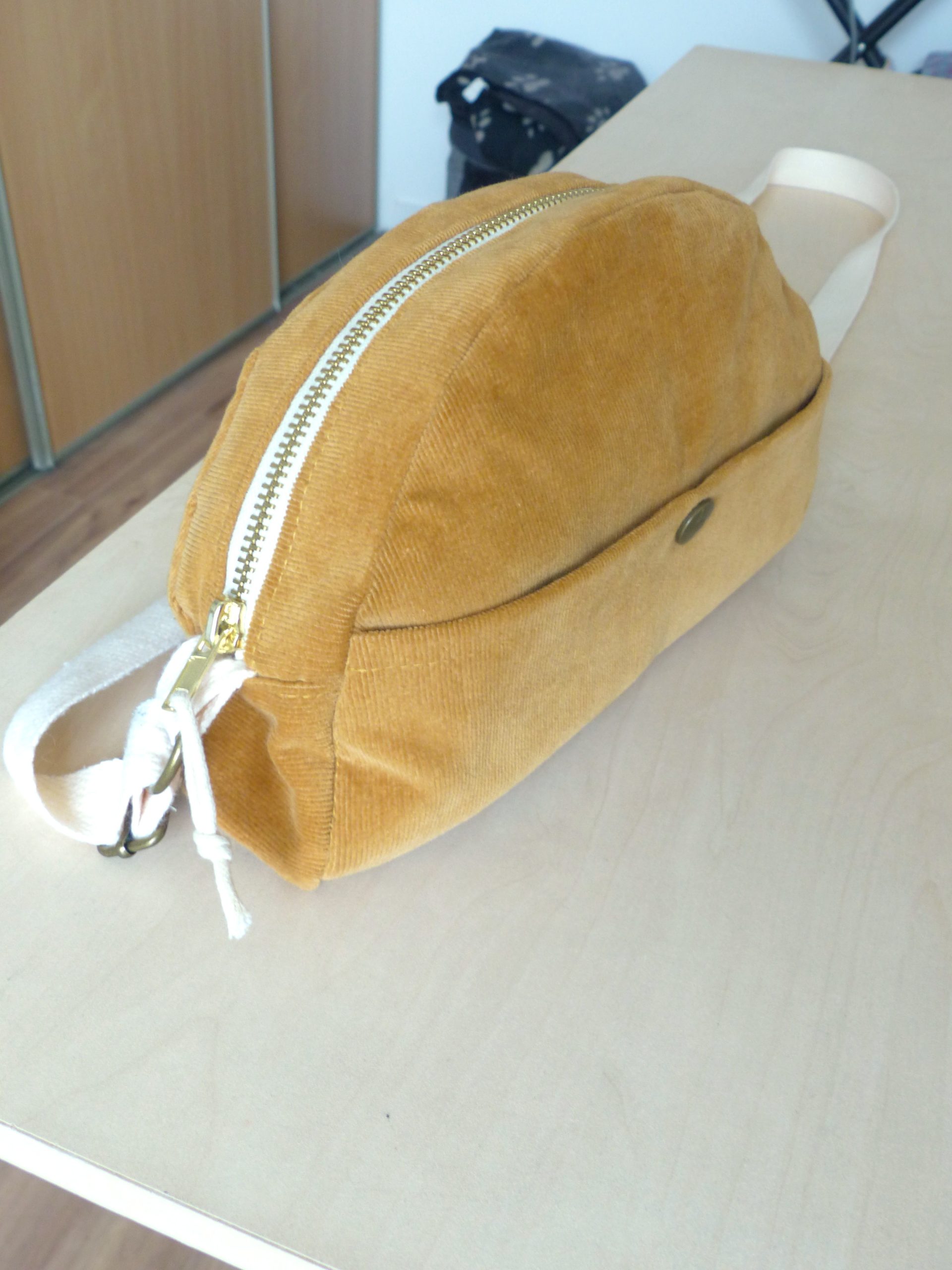 J’ai cousu ma première version du sac Roméo en taille 3 (la plus grande) dans un velours milleraies camel de Mondial tissus et j’avais un petit coupon de Liberty Thorpe rouille pour la doublure.