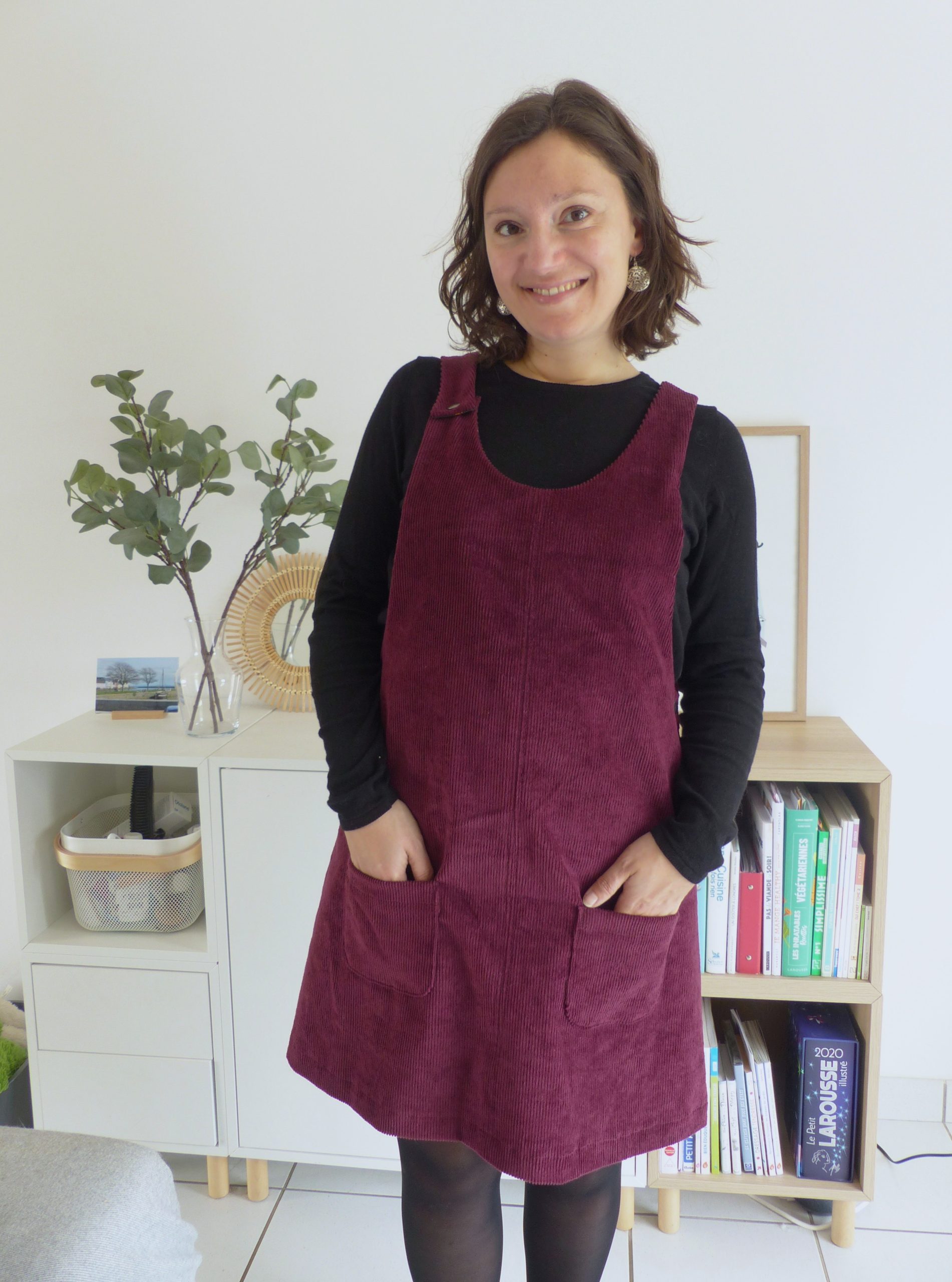 6- La robe chasuble Toronto de Ikatee en velours bordeaux ici.