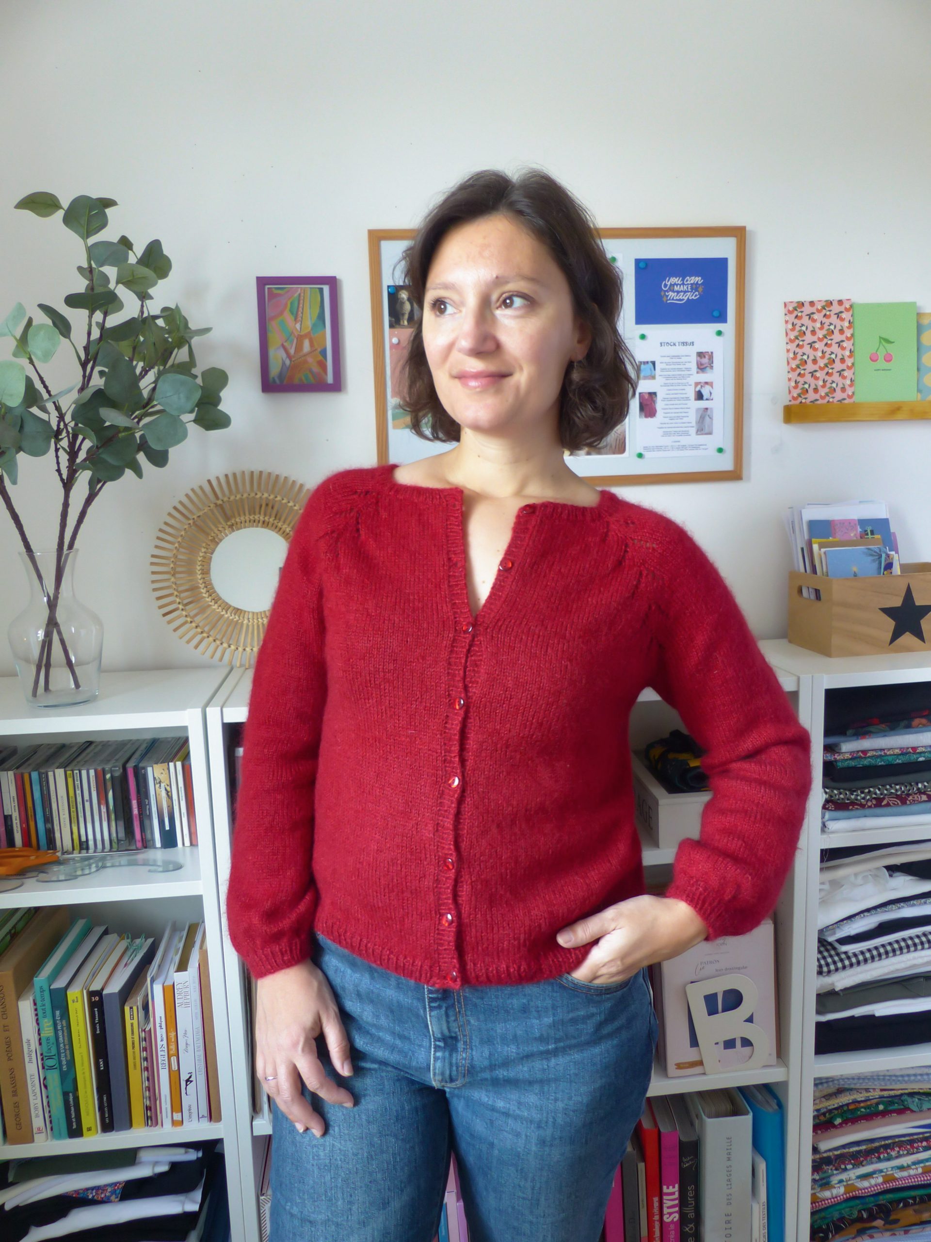 10- Le Cardigan Rosa de Along avec Anna en laine Ombelle vert ici et rouge foncé là.